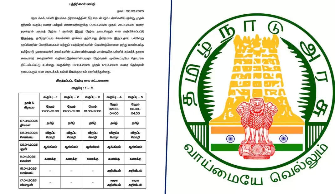 இன்று ஏப்ரல் 7ம் தேதி வழக்கம் போல் 10ம் வகுப்பு பொதுத்தேர்வு நடைபெறும். இதற்கு மாறாக 1 முதல் 5ம் வகுப்பு மாணவர்களுக்கு இன்று ஏப்ரல் 7ம் தேதி நடைபெறுவதாக இருந்த ஆண்டு தேர்வு நாளை ஏப்ரல் 8ம் தேதி நடைபெறும் என அறிவிக்கப்பட்டுள்ளது.
