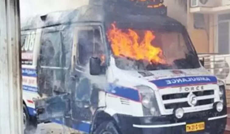 அப்போது ஆம்புலன்ஸில் இருந்த ஆக்சிஜன் சிலிண்டர் திடீரென வெடித்தது. அதன் காரணமாக தீ கட்டுக்கடங்காமல் கொழுந்துவிட்டு எரியத் தொடங்கியது.