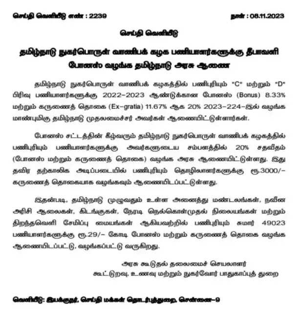 தமிழ்நாடு நுகர்பொருள் வாணிபக் கழக பணியாளர்களுக்கு தீபாவளி போனஸ் வழங்கப்படும் என தமிழ்நாடு அரசு அதிகாரப்பூர்வமாக அறிவித்துள்ளது. இதுகுறித்து வெளியிடப்பட்டுள்ள அறிக்கையில், “தமிழ்நாடு நுகர்பொருள் வாணிபக் கழகத்தில் பணிபுரியும் “C” மற்றும் “D” பிரிவு பணியாளர்களுக்கு 2022-2023 ஆண்டுக்கான போனஸ் 8.33% மற்றும் கருணைத் தொகை 11.67% ஆக 20% 2023-224ல் வழங்க முதல்வர் உத்தரவு பிறப்பித்துள்ளார்.