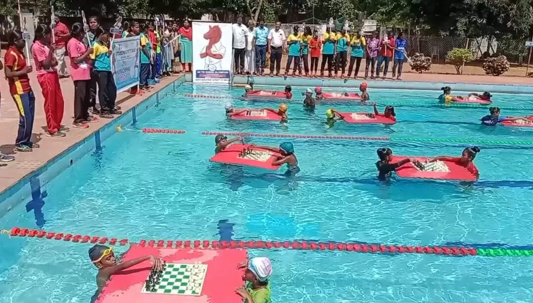 நீச்சல் குளத்தில் மிதக்கும் செஸ் போர்டு! ஜாலியா ஆட்டம் போட்ட மாணவர்கள்!