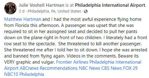 சக பயணியான ஜூலி வோஷெல் ஹார்ட்மேன் இந்த வீடியோவையும், சம்பவத்தின் சில விவரங்களையும் பேஸ்புக்கில் பகிர்ந்துள்ளார். அவரது பதிவில் குறிப்பிட்டுள்ளதாவது, "இன்று மதியம் புளோரிடாவிலிருந்து வீட்டிற்கு பறந்ததில் எனக்கும் மேத்யூ ஹார்ட்மேனுக்கும் மிகவும் மோசமான அனுபவம் கிடைத்தது. ஒரு பயணி தனக்கு ஒதுக்கப்பட்ட இருக்கையில் அமர வேண்டும் என்று வருத்தமடைந்தார், மேலும் இரண்டு குழந்தைகளுக்கு முன்னால் தனது பேண்ட்டை விமானத்தில் கீழே இழுக்க முடிவு செய்தார். என்னுடைய முன் வரிசையில் இருக்கை வைத்திருந்தேன். மற்றொரு பயணியை கொன்று விடுவதாக மிரட்டினார். நான் அவளை உட்காரச் சொன்ன பிறகு அவள் என்னை மிரட்டினாள்,” என்று ஹார்ட்மேன் எழுதினார்.
