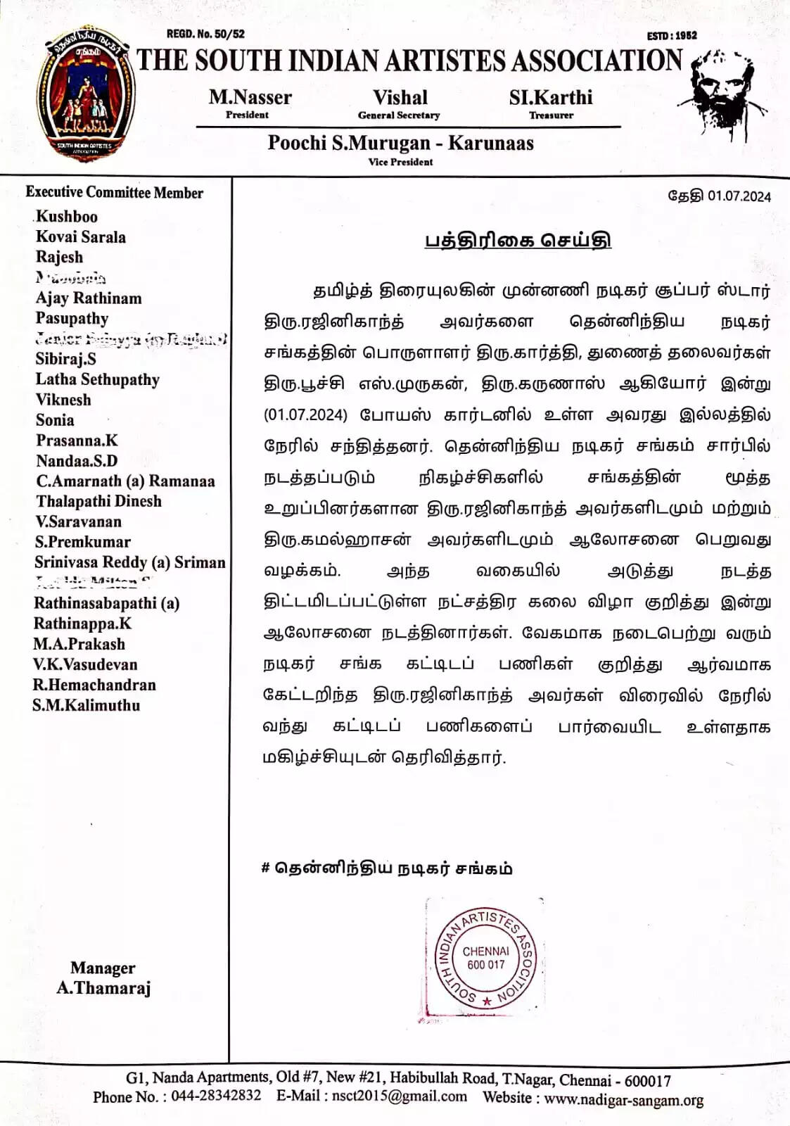 தமிழ்த் திரையுலகின் சூப்பர் ஸ்டார் நடிகர் ரஜினிகாந்த்தை இன்று அவர்களை தென்னிந்திய நடிகர் சங்கத்தின் பொருளாளர் திரு.கார்த்தி, துணைத் தலைவர்கள் திரு.பூச்சி எஸ்.முருகன், திரு.கருணாஸ் ஆகியோர் போயஸ் கார்டனில் உள்ள அவரது இல்லத்தில் நேரில் சந்தித்து ஆலோசனை நடத்தினர். தென்னிந்திய நடிகர் சங்கம் சார்பில் நடத்தப்படும் அனைத்து நிகழ்ச்சிகள் குறித்த தகவல்களை ரஜினிகாந்த் மற்றும் கமல்ஹாசன் இருவரிடமும் ஆலோசனை பெறுவது வழக்கம்.