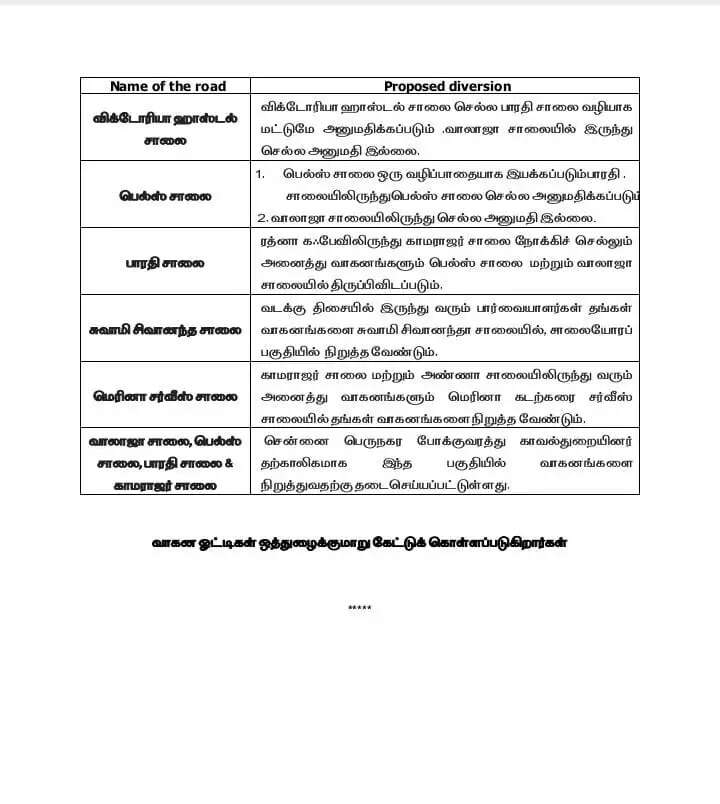 வாலாஜா சாலையிலிருந்து செல்ல அனுமதி இல்லை. ரத்னா கஃபேவிலிருந்து காமராஜர் சாலை நோக்கிச் செல்லும் அனைத்து வாகனங்களும் பெல்ஸ் சாலை மற்றும் வாலாஜா சாலையில் திருப்பிவிடப்படும். வடக்கு திசையில் இருந்து வரும் பார்வையாளர்கள் தங்கள் வாகனங்களை சுவாமி சிவானந்தா சாலையில், சாலையோரப் பகுதியில் நிறுத்த வேண்டும்.