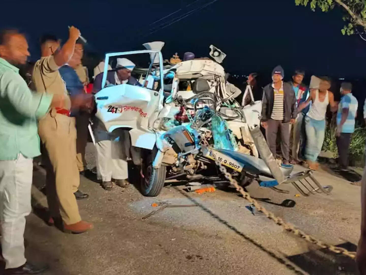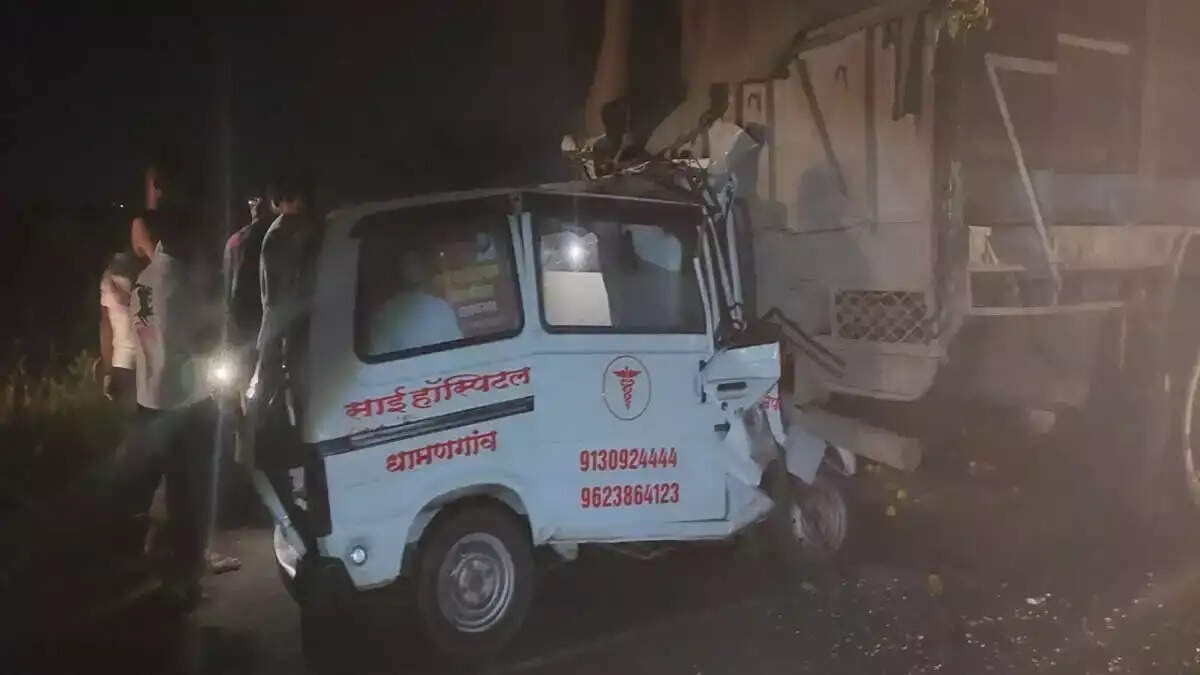 இரவு 9.30 மணியளவில் ஆம்புலன்ஸ் தமன்காவ் - அகமதுநகர் ரோட்டில் அம்போரா பகுதியில் சென்று கொண்டு இருந்தது. அப்போது முன்னால் சென்ற லாரி திடீரென இடது புறமாக திரும்பியது. இதன் காரணமாக கண் இமைக்கும் நேரத்தில் பின்னால் வேகமாக வந்த ஆம்புலன்ஸ், லாரி மீது மோதியது. இந்த பயங்கர விபத்தில் ஆம்புலன்ஸ் அப்பளம் போல நொறுங்கியது.