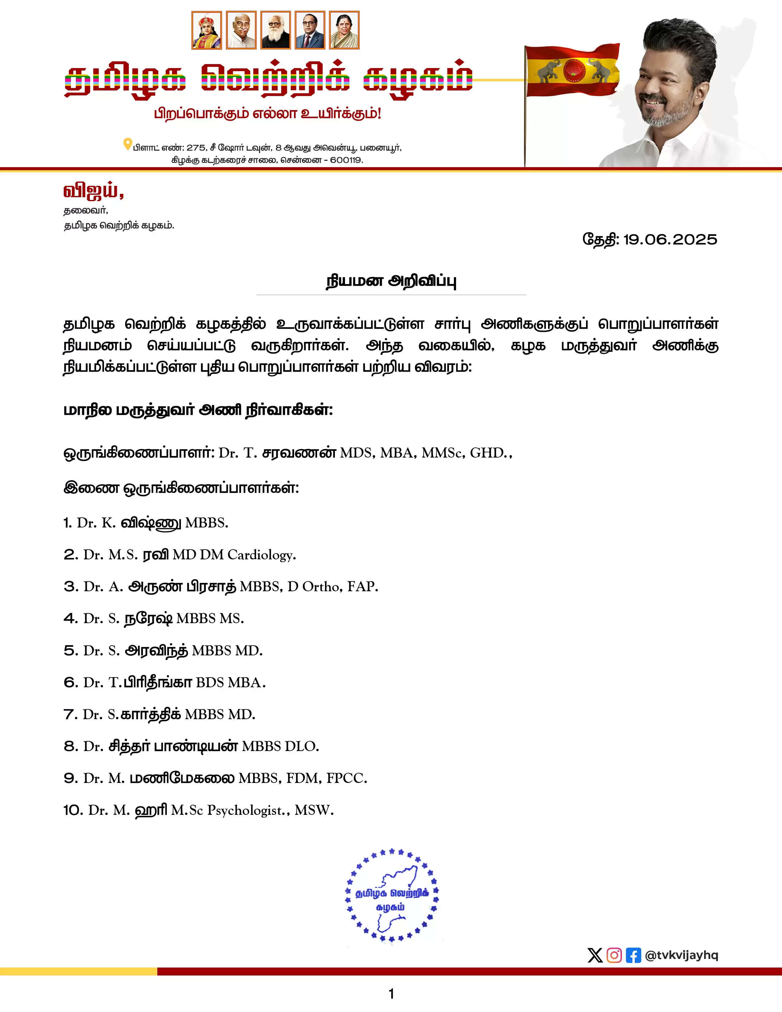 2026 தவெக தகவல் தொழில்நுட்ப அணி மற்றும் சமூக ஊடக அணி , சட்ட ஆலோசனை அணி மற்றும் வழக்கறிஞர்கள் அணியின்  புதிய பொறுப்பாளர்கள் நியமிக்கப்பட்டனர். தொடர்ந்து இன்றைய தினம் மருத்துவர்கள் அணிக்கான புதிய நிர்வாகிகள் நியமிக்கப்பட்டுள்ளனர்.  14 பேர் அடங்கிய புதிய நிர்வாகிகளின் பட்டியலை தவெக தலைமை வெளியிட்டுள்ளது.  புதிதாக நியமிக்கப்பட்டுள்ள பொறுப்பாளர்களுக்கு வாழ்த்து தெரிவித்துள்ளார். கழகத்தின் உத்தரவு மற்றும் ஆலோசனைப்படி செயல்பட வேண்டும் என அறிவுறுத்தியுள்ளார்.  புதிய பொறுப்பாளர்களுக்கு நிர்வாகிகள் மற்றும் கழக தோழர்கள் ஒத்துழைப்பு வழங்கவேண்டும் எனவும் வேண்டுகோள் விடுத்துள்ளார்.