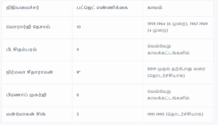 இந்திய வரலாற்றில் அதிக முறை பட்ஜெட் தாக்கல் செய்தவர்களில் மொரார்ஜி தேசாய் முதலிடத்தில் இருந்தாலும், ஒரே பிரதமரின் கீழ் தொடர்ச்சியாக 9 பட்ஜெட் தாக்கல் செய்வது குறிப்பிடத்தக்க சாதனையாக பார்க்கப்படுகிறது. சுதந்திர இந்தியாவின் முதல் பட்ஜெட்டை தமிழ்நாட்டைச் சேர்ந்த ஆர்.கே. சண்முகம் செட்டி தாக்கல் செய்தது நினைவுகூரப்படுகிறது. இந்த நிலையில், பிப்ரவரி 1-ம் தேதி தாக்கல் செய்யப்படும் பட்ஜெட்டுக்கு நாடு முழுவதும் பெரும் எதிர்பார்ப்பு நிலவுகிறது.
