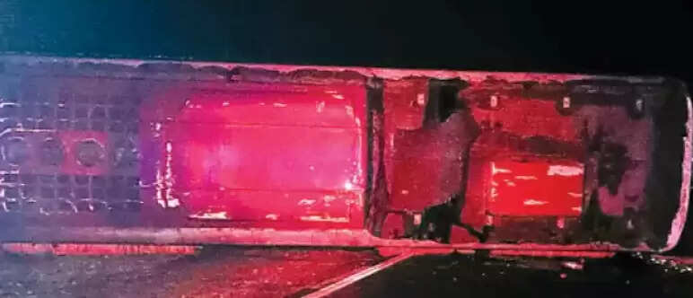 தார் மெஷின் மீது தனியார் பேருந்து மோதி கவிழ்ந்த பேருந்து... 17 பேர் படுகாயம்!