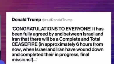 இஸ்ரேல் - ஈரான் இடையிலான போர் முடிவுக்கு வந்ததாக அமெரிக்க அதிபர் ட்ரம்ப் அதிகாரபூர்வமாக அறிவித்தார். இதுகுறித்து, டிரம்ப் சமூக வலைப்பக்கத்தில் அனைவருக்கும் எனது மனமார்ந்த வாழ்த்துகள். இஸ்ரேலும் ஈரானும் போர்நிறுத்தத்துக்கு முழுமையாக ஒப்புக்கொண்டன. இரு நாடுகளின் ராணுவ நடவடிக்கைகளும் முடிந்தவுடன், சுமார் 6 ஆறு மணிநேரத்தில் ஈரான் போர் நிறுத்தத்தைத் தொடங்கும். அதனைத் தொடர்ந்து, 12 மணிநேரத்தில் இஸ்ரேலும் போர்நிறுத்தத்தைத் தொடங்கும். அடுத்த 24 மணிநேரத்தில் இஸ்ரேல் - ஈரான் இடையிலான 12 நாள் போரின் முடிவு குறித்த அதிகாரபூர்வ அறிவிப்பு வெளியாகும்.
