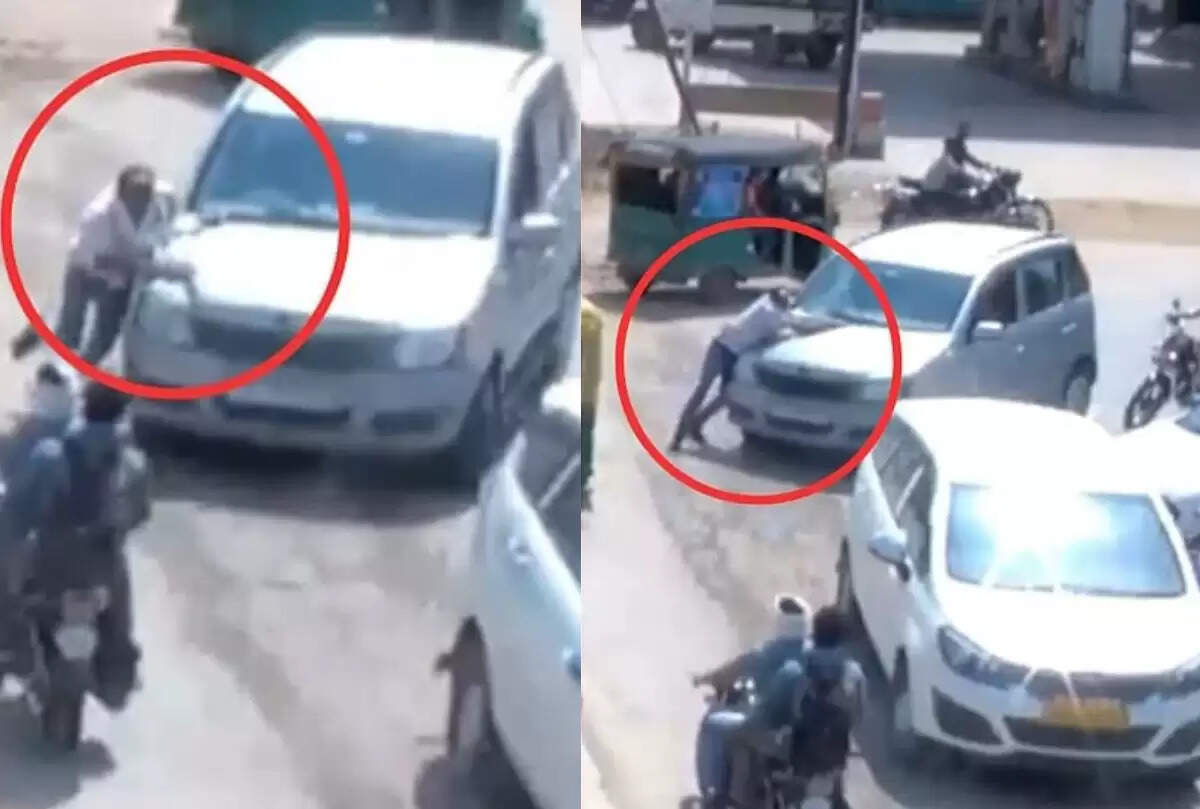 #WATCH | MP: Thieves Drag Policeman On Car Bonnet While Fleeing With Cash & ATM Card In Gwalior; Incident Caught On CCTV#MPNews #MadhyaPradesh #viralvideo pic.twitter.com/Ytz63WPd3O