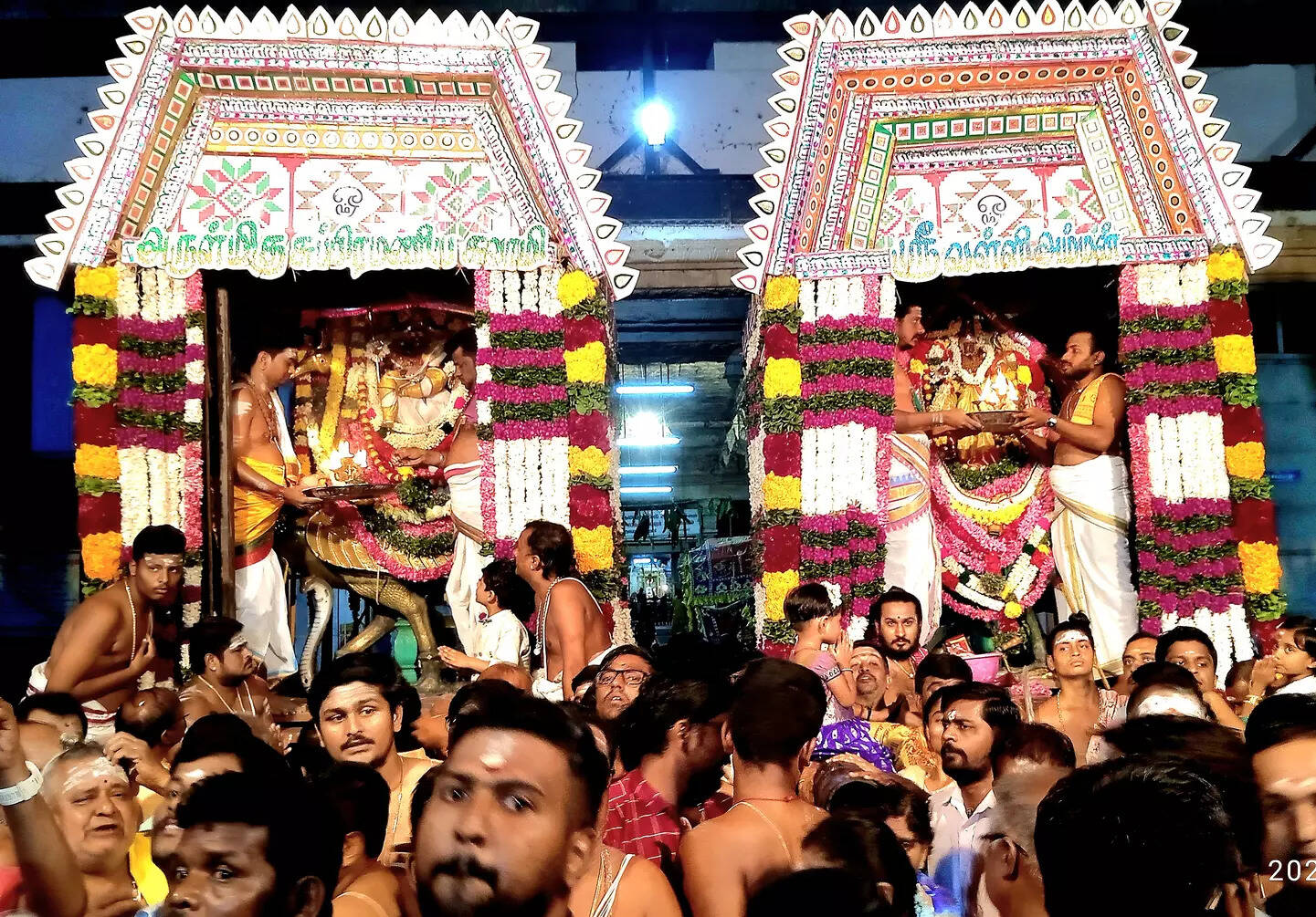 இரவு 7.20 மணிக்கு ஆனந்தவல்லி அம்பாள் சமேத சிவக்கொழுந்தீசுவரர் கோவில் பிரதான வாயில் அடைக்கப்பட்டது. குமரவிடங்க பெருமான், தெய்வானை அம்பாள் தனித்தனி தங்க மயில் வாகனத்தில் எழுந்தருளினர். பின்னர் பிரதான வாயில் திறக்கப்பட்டு, குடவருவாயில் சிறப்பு தீபாராதனை நடந்தது. தொடர்ந்து கீழ ரதவீதி பந்தல் மண்டப முகப்பில் வெள்ளி சப்பரத்தில் எழுந்தருளி இருந்த சுவாமி ஜெயந்திநாதருக்கு எதிர்சேவை தீபாராதனையும் நடந்தது. இதில் திரளான பக்தர்கள் கலந்து கொண்டு சாமி தரிசனம் செய்தனர்.