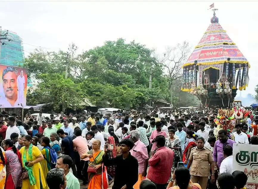 மன்னார்குடி ராஜகோபால சுவாமி கோயில் பங்குனி தேரோட்ட திருவிழாவில் கொட்டும் மழையில் நனைந்தபடி ஆயிரக்கணக்கான பக்தர்கள் தேரை வடம் பிடித்து இழுத்தனர்.