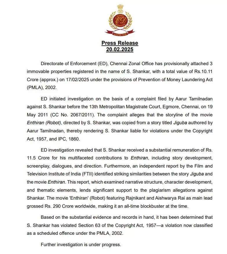 இது குறித்து அமலாக்கத்துறையினர் சார்பில் வெளியிட்டுள்ள அறிக்கையில் இயக்குநர் ஷங்கர், நடிகர் ரஜினி, ஐஸ்வர்யா ராய் உள்ளிட்ட நட்சத்திரங்களின் நடிப்பில் இயக்கிய எந்திரன் படத்திற்கு கதை உருவாக்குதல், வசனம், இயக்கம் என்று ரூ.10.11 கோடி ஊதியம் பெற்றிருப்பதாகவும், இந்த படத்தின் கதைத் தொடர்பாக எழுத்தாளர் ஆரூர் தாஸ் அளித்த புகாரின் பேரில் ஆரூர் தாஸ் எழுதிய சிறுகதையும், இயக்குநர் ஷங்கரின் எந்திரன் படத்திற்கும் நிறைய ஒற்றுமை இருப்பதாகவும் கூறி, இது தொடர்பான விசாரணையில் இயக்குநர் ஷங்கரின் ரூ.10.11 கோடி மதிப்புள்ள சொத்துக்களை அமலாக்கத்துறையினர் முடக்கியுள்ளனர்.