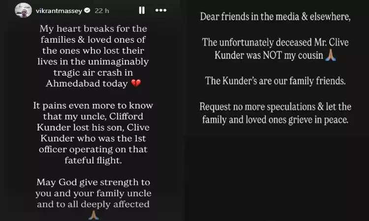 குஜராத் மாநிலம் அகமாதாபாத்தில் எதிர்பாராத விதமாக ஏர் இந்தியா விமானம் விபத்தில் 241 பேர் பலியாகியிருக்கின்றனர். அதில் ஒருவர் "12-த் பெயில்" திரைப்படத்தின் நாயகன் விக்ராந்த் மாஸ்ஸியின் நண்பர் விமானி கிளைவ் குந்தர். விமானியாகப் பணியாற்றிய அவரின் மரணம் குறித்து விக்ராந்த் மாஸ்ஸி தன் இன்ஸ்டாகிராமில் "அகமதாபாத்தில் நடந்த கற்பனை செய்ய முடியாத துயரமான விமான விபத்தில், உயிர் இழந்தவர்களின் குடும்பங்கள் மற்றும் அன்புக்குரியவர்களுக்காக என் இரங்கலைத் தெரிவித்துக்கொள்கிறேன்.என் மாமா கிளிபோர்ட் குந்தர் தனது மகன் கிளைவ் குந்தரை இழந்தார் என்பதை அறிந்து இன்னும் வேதனையாக இருக்கிறது. அவர் அந்த துரதிர்ஷ்டவசமான விமானத்தை இயக்கிய அதிகாரி. கடவுள் உங்களுக்கும் உங்கள் குடும்பத்தினருக்கும், மாமாவிற்கும், பாதிக்கப்பட்ட அனைவருக்கும் பலம் அளிக்கட்டும்" என தெரிவித்திருக்கிறார்.