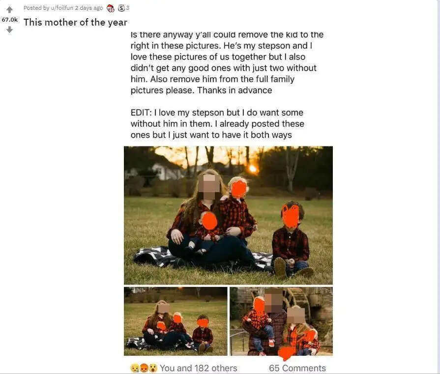 வலது பக்கம் அமர்ந்திருக்கும் குழந்தையை அகற்ற உங்களில் யாருக்காவது வழி இருக்கிறதா என்று கேட்டாள். அவன் என் வளர்ப்பு மகன். நான் இந்த புகைப்படத்தை விரும்புகிறேன். ஆனால் எனது இரண்டு குழந்தைகளுடன் இருக்கும் புகைப்படம் மட்டும் எனக்கு பிடிக்கும். தயவு செய்து அவரை படங்களிலிருந்து நீக்கவும். என்று பதிவிட்டார். இந்தப் பெண்ணின் இந்தப் பதிவால் மக்கள் கொதிப்படைந்துள்ளனர். ஒருவர் பின் ஒருவராக கருத்து சொல்ல ஆரம்பித்தனர். இந்த பதிவை யாரோ reddit இல் பதிவிட்டுள்ளனர். அதற்கு பல கருத்துக்கள் கிடைத்தன. பெண்ணின் சுயநலத்தை மக்கள் கண்டித்துள்ளனர். ஒரு பெண் தன் வளர்ப்பு மகனின் மனநிலையை அவள் எவ்வளவு தூரம் வைத்திருக்கிறாள் என்பதன் மூலம் சொல்ல முடியும் என்று பரிந்துரைத்துள்ளார்.
