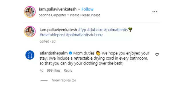 இன்ஸ்டாகிராமில் அவர் பதிவிட்ட வீடியோவில், பல்லவியின் தாய் கடற்கரை ரிசார்ட்டில் உள்ள அவர்களின் அறையின் பால்கனியில் துணிகளை உலர்த்துவதை நாம் காணலாம். மேலும், "அட்லாண்டிஸிலும் அம்மா எப்போவும் அம்மா தான் " என்று வீடியோவில் பதிவிட்டுள்ளார். இந்த வீடியோ வைரலானதையடுத்து, ஹோட்டல் பதிவில் கருத்து தெரிவித்துள்ளது. அந்த கருத்தில், “ஒரு தாயின் கடமைகளை நாங்கள் பாராட்டுகிறோம். உங்கள் விடுமுறையை நீங்கள் அனுபவித்து மகிழ்கிறீர்கள் என்று நம்புகிறோம்.