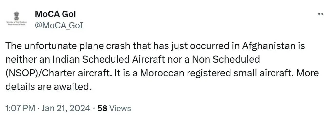 பல ஆப்கானிஸ்தான் ஊடகங்கள் முரண்பட்ட அறிக்கைகளை மேற்கோள் காட்டின, சிலர் இது ஒரு பட்டய விமானம் என்றும் அது மாஸ்கோவிற்குச் சென்று கொண்டிருந்தபோது விபத்துக்குள்ளானதாகவும் கூறினார், சிலர் இது ஒரு பயணிகள் விமானம் என்றும் கூறினர். பின்னர், மொராக்கோ நாட்டைச் சேர்ந்த சிறிய ரக விமானம் என உறுதிப்படுத்தப்பட்டுள்ளது