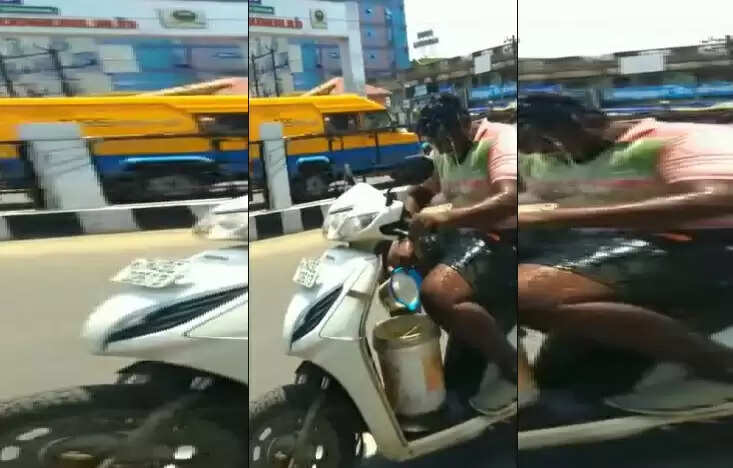 தஞ்சாவூர் பழைய பேருந்து நிலையம் மற்றும் பெரியகோயில் பகுதி எப்போதும் போக்குவரத்து நெரிசல் மிகுந்த பகுதிகளாகும். இப்பகுதிகளில் நிலவும் கடும் வெயிலின் தாக்கத்தை உணர்த்தும் விதமாக இளைஞர் ஒருவர் தனது பைக்கில் சென்றவாறு குளித்துள்ளார். பைக் முன் பக்கம் வாளியில் தண்ணீர் வைத்து, குளித்துக் கொண்டே வாகனத்தை ஓட்டினார்.
