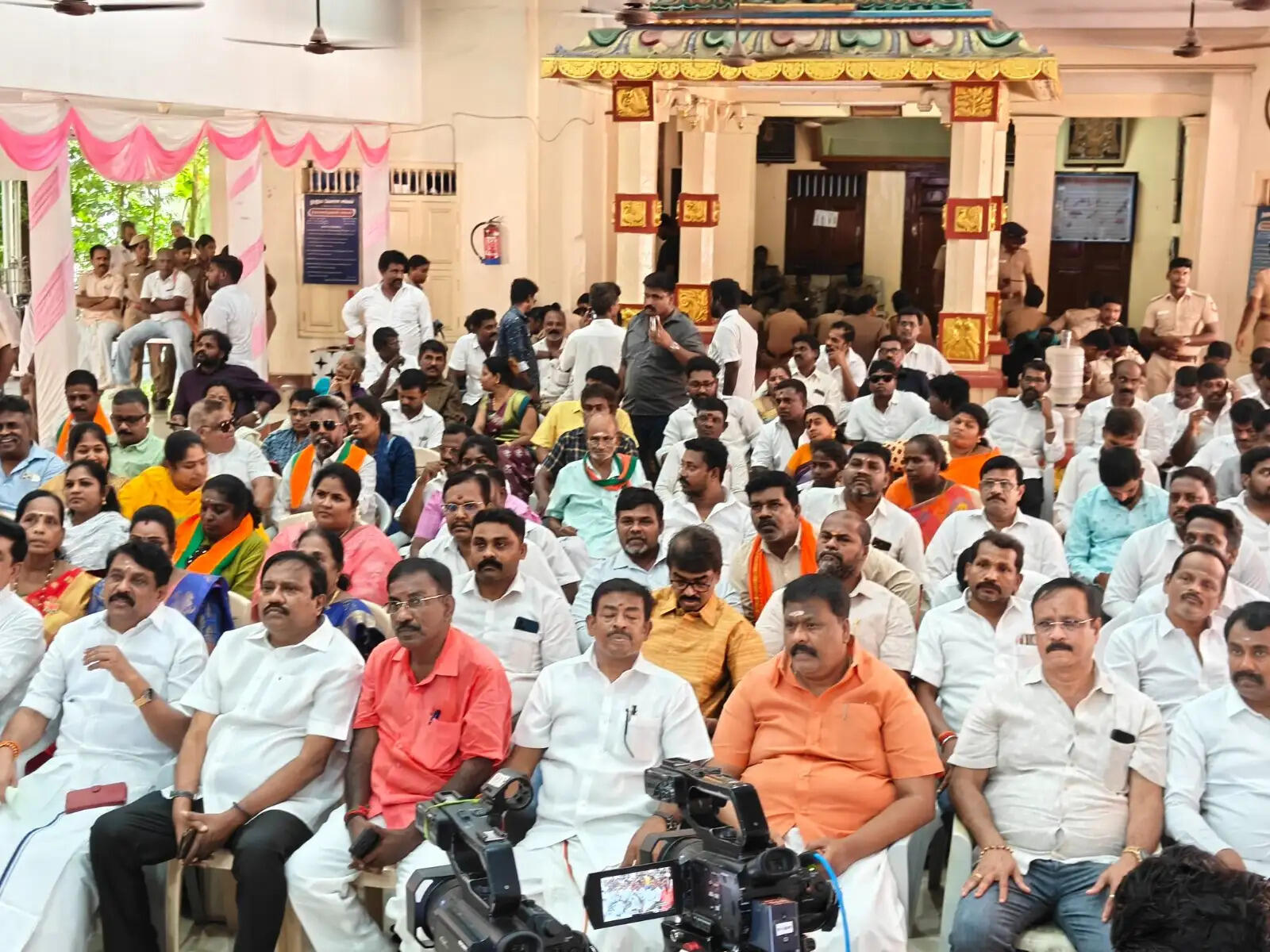 துணை முதல்வர் உதயநிதியின் தொகுதியாக இருக்கும் காரணத்தினால் காவல் இணை ஆனையர் பாஜக நிகழ்ச்சி நடத்தக்கூடாது என கூறினாரா என்பது தெரியவில்லை. காவல்துறையின் இந்த நடவடிக்கைக்கு எங்களது கடுமையான கண்டனங்களை நாங்கள் பதிவு செய்கிறோம். துணை முதல்வராக இருக்கக்கூடிய காரணத்தினால் அடக்கு முறையை கையில் எடுக்கலாம் என உதயநிதி எண்ண வேண்டாம்? மக்கள் மாற்றத்தை கொண்டு வர வேண்டும் என எண்ணி விட்டார்கள், ஆட்சி என்பது நிரந்தரமானது இல்லை என்பதை இந்த நேரத்தில் தெரிவிக்க விரும்புகிறேன். நிகழ்ச்சி நடத்துவதற்கு அனுமதி கடிதம் கொடுத்து ஒரு வாரம் நிறைவு பெற்றுள்ளது. ஆனால் இன்று பொது இடத்தில் செய்யக்கூடாது மண்டபத்தில் செய்யுங்கள் எனக் கூறியுள்ளார். மண்டபத்தில் ஒதுக்கியதற்கு விஜயகுமாருக்கு ஒரு விதத்தில் நன்றி கூறலாம். வெளியில் செய்திருந்தால் வெயிலில் நின்று இருக்க வேண்டும், இங்கே குளிர்ச்சியாக உள்ளது. ஆகவே அவருக்கு நன்றி. கூட்டணி ஆட்சி அதிகாரத்தின் பங்கு எனக்கூறி கூட்டணிக்கு அழைத்த அதிமுக மற்றும் த.வெ.க கதவுகளை மூடிவிட்டதாக விடுதலை சிறுத்தை கட்சி தலைவர் தொல் திருமாவளவன் கூறுகிறார். திருமாவளவன் ஒரு கூட்டணியில் உள்ளார். அடுத்தவர் வீட்டின் கதவை மூட திருமாவளவன் யார்? வேண்டுமானால், திருமாவளவன் அவர் வீட்டு கதவை மூடிக் கொள்ளட்டும்” என்றார்.