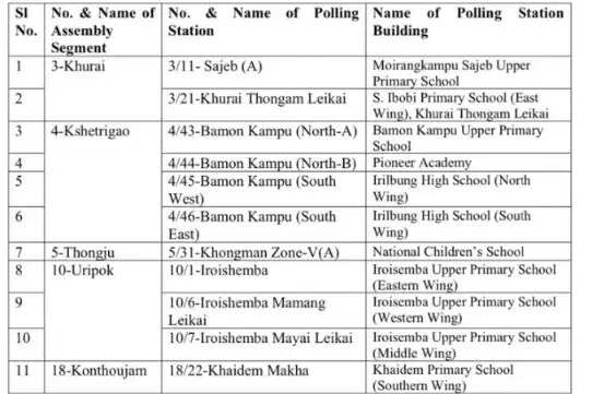 வன்முறை, கலவரம் மற்றும் நாசவேலைகள் போன்ற புகார்களைத் தொடர்ந்து ஏப்ரல் 19 ஆம் தேதி முதல் கட்டமாக இந்த நிலையங்களில் நடத்தப்பட்ட தேர்தல்கள் செல்லாது என தேர்தல் கமிஷன் உத்தரவு பிறப்பித்ததை அடுத்து இந்த அறிவிப்பு வந்தது. மற்றும் இம்பால் கிழக்கு மாவட்டத்தில் தோங்ஜுவில் ஒன்று மற்றும் யூரிபோக்கில் மூன்று மற்றும் இம்பால் மேற்கு மாவட்டத்தில் உள்ள கொந்தௌஜாமில் ஒன்று.