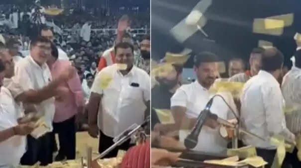 ஒவ்வொரு நோட்டாக எடுத்து மேடையை நோக்கி மக்கள் வீசினர். இதனால், மேடை முழுவதும் ரூபாய் நோட்டுகளால் நிரம்பியது. நிகழ்ச்சியில் பங்கேற்க வந்தவர்கள் இதற்காக 10, 20, 50, 100 ரூபாய் நோட்டுக் கட்டுகளாக மாற்றி கொண்டு வந்திருந்தனர்.