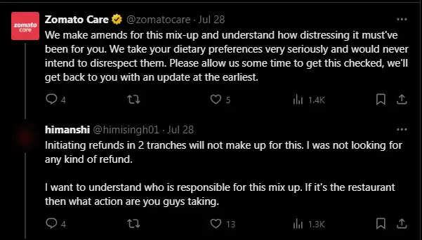 இதனை கவனத்தில் கொண்ட Zomato, தவறுக்கு மன்னிப்பு கேட்டுள்ளதுடன், உணவு பரிமாற்றம் குறித்து விசாரணை நடத்தப்படும் என தெரிவித்துள்ளது. அந்த குறிப்பில், இந்த சம்பவம் உங்களை எந்தளவு பாதித்திருக்கும் என்பதை நாங்கள் புரிந்துகொள்கிறோம். உங்கள் உணவு விருப்பங்களை நாங்கள் மிகவும் தீவிரமாக எடுத்துக்கொள்கிறோம் மற்றும் அவற்றை மதிக்கிறோம். ஒருபோதும் அவமரியாதை எடுத்து கொள்ளாதீர்கள். இந்தச் சிக்கலைச் சரிசெய்ய சிறிது நேரம் கொடுங்கள். இதற்கான தீர்வோடு விரைவில் உங்களை மீண்டும் சந்திப்போம் என குறிப்பிட்டுள்ளனர்.