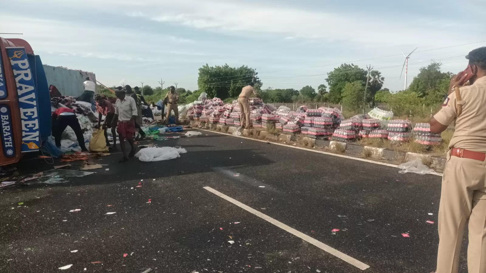 திருநெல்வேலி மாவட்டம் எட்டயபுரம் அருகே தேசிய நெடுஞ்சாலையில் குளிர்பானங்கள் ஏற்றிக் கொண்டு சென்றுக் கொண்டிருந்த லாரி கவிழ்ந்து விபத்துக்குள்ளானது.