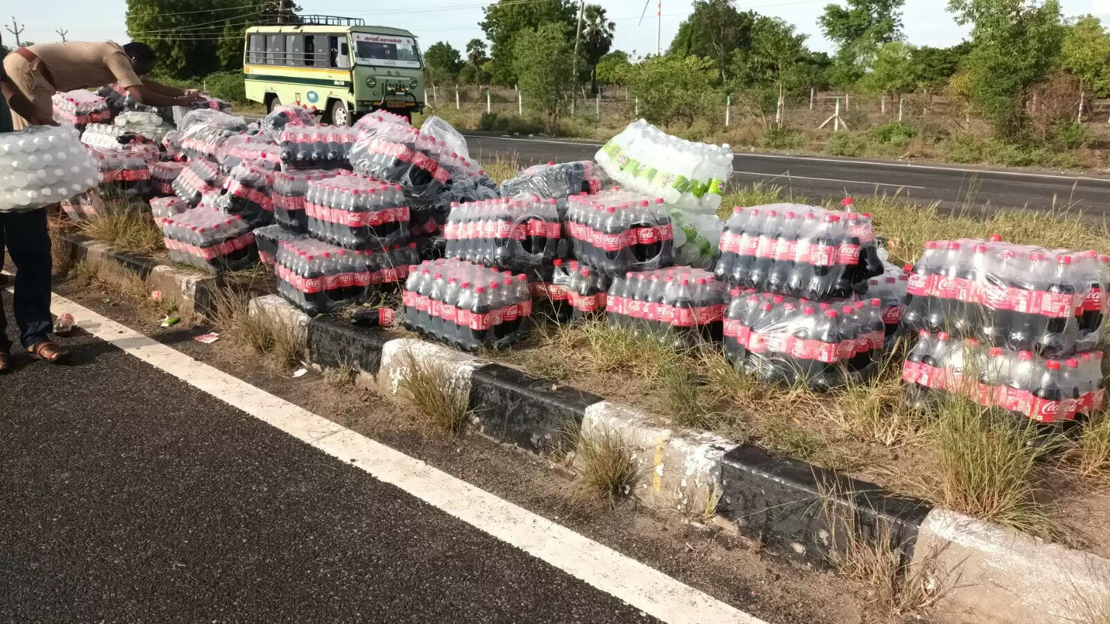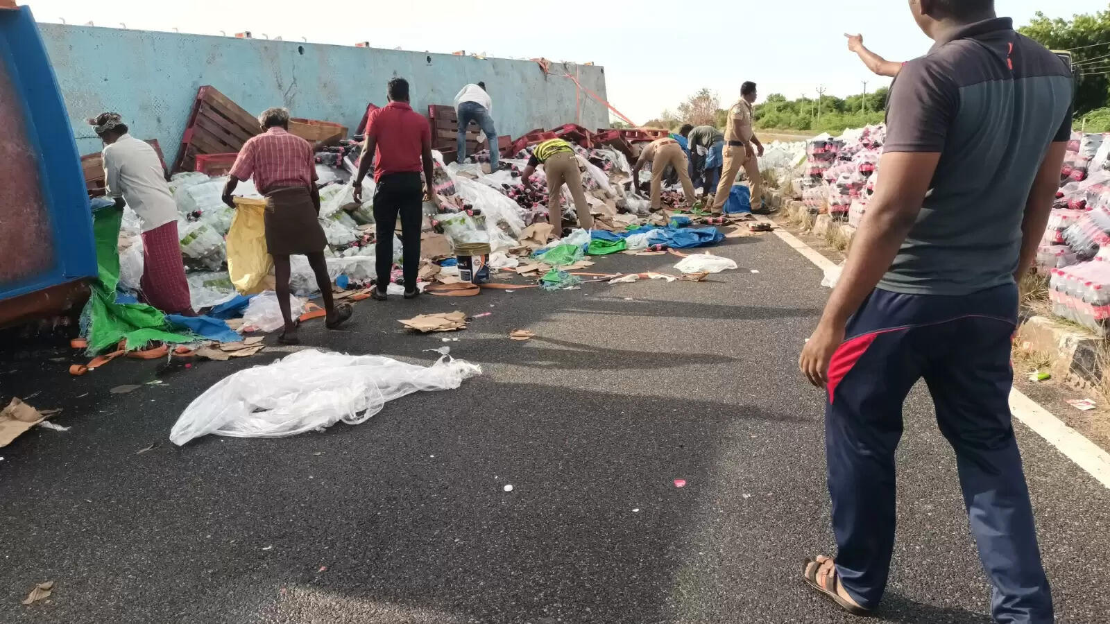 சில்லு சில்லாய் சிதறிய பாட்டில்கள்... கூல்டிரிங்க்ஸ் ஏற்றி வந்த லாரி கவிழ்ந்து விபத்து!