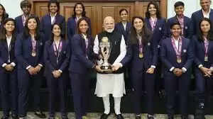 தென்னாப்பிரிக்காவை வீழ்த்தி வரலாற்று சிறப்புமிக்க வெற்றி பெற்ற இந்திய மகளிர் கிரிக்கெட் அணியை பிரதமர் நரேந்திர மோடி தனது லோக் கல்யாண் மார்க் இல்லத்தில் புதன்கிழமை சந்தித்து வாழ்த்தினார். தொடர்ச்சியான மூன்று தோல்விகளுக்குப் பிறகு அணியினர் தன்னம்பிக்கையுடன் மீண்டு சாம்பியன் பட்டம் வென்றதற்கு அவர் பாராட்டு தெரிவித்தார். அணி சார்பில் வீராங்கனைகள் “நமோ 1” என அச்சிடப்பட்ட கையொப்ப ஜெர்சியை பிரதமருக்கு பரிசளித்தனர்.