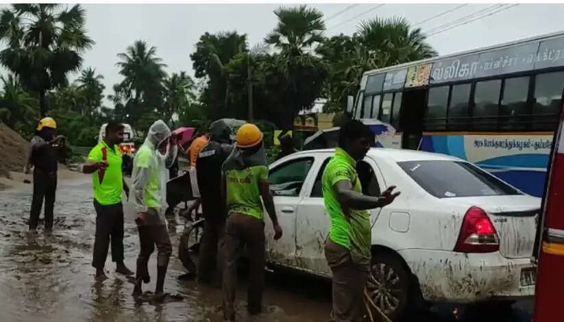 தமிழகத்தில் வடகிழக்கு பருவமழை காரணமாக பல பகுதிகளில் கனமழை வெளுத்து வாங்கி வருகிறது. இதனால் பல்வேறு மாவட்டங்களுக்கு இன்று பள்ளி கல்லூரிகளுக்கு விடுமுறை அறிவிக்கப்பட்டது. அந்த வகையில் மயிலாடுதுறை மாவட்டம், தரங்கம்பாடியில் தாலுகாவில் நேற்று முதல் தற்போது வரை தொடர் மழை பெய்து வருகிறது. இன்று காலை 6 மணி நிலவரப்படி 77.1 மில்லி மீட்டர் மழை பதிவாகியிருந்தது. இந்நிலையில், தரங்கம்பாடி தாலுகா திருக்கடையூர் அருகே விழுப்புரம் முதல் நாகப்பட்டினம் வரையிலான நான்கு வழிச்சாலை பணிக்காக மணல் குவியல்கள் ஆங்காங்கே குறிப்பிட்ட இடைவெளியில் கொட்டி வைக்கப்பட்டுள்ளது.