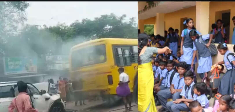 பரபரப்பு... கார் மீது மோதியதில் தீப்பிடித்த பள்ளி வாகனம்... அலறி அடித்து இறங்கி ஓடிய மாணவர்கள்!