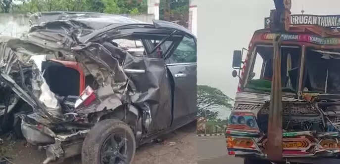 தறிகெட்டு அலைபாய்ந்த லாரி... சுக்குநூறாய் நொறுங்கிய கார்... சம்பவ இடத்திலேயே 2 பேர் பலி!