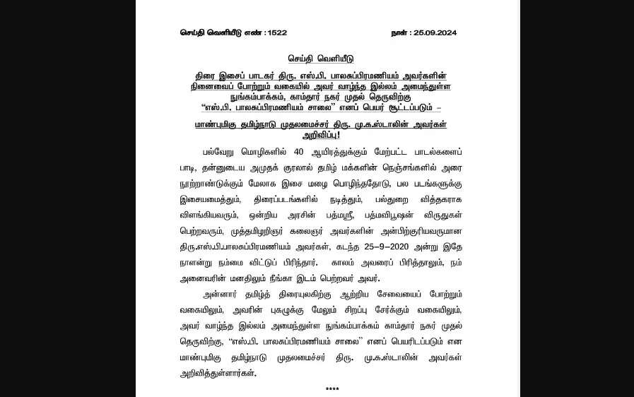 காலம் அவரைப் பிரித்தாலும், நம் அனைவரின் மனதிலும் நீங்கா இடம் பெற்றவர் அவர். அன்னார் தமிழ்த் திரையுலகிற்கு ஆற்றிய சேவையைப் போற்றும் வகையிலும், அவரின் புகழுக்கு மேலும் சிறப்பு சேர்க்கும் வகையிலும், அவர் வாழ்ந்த இல்லம் அமைந்துள்ள நுங்கம்பாக்கம் காம்தார் நகர் முதல் தெருவிற்கு, "எஸ்.பி. பாலசுப்பிரமணியம் சாலை” எனப் பெயரிடப்படும் என மாண்புமிகு தமிழ்நாடு முதலமைச்சர் திரு. மு.க.ஸ்டாலின்அறிவித்துள்ளார்” என்று தெரிவிக்கப்பட்டுள்ளது.