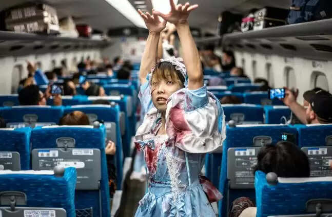 ஜப்பானில் ரயிலில் கொரிய படமான ட்ரைன் டூ பூசன் பட பயணிகளை ஜாம்பிகள் போல் வேடம் போட்டு உடையணிந்தவர்கள் மிரட்டும் காட்சிகள் அனைவரையும் கவர்ந்துள்ளது. ஹாலோவீன் பண்டிகையையொட்டி, உலகம் முழுவதும் வித விதமான வேடம் போட்டு பொதுமக்கள் அனைவரும் உற்சாகமாக கொண்டாடுவார்கள். இந்நிலையில் ஜப்பான் புல்லட் ரயில் பயணிகளுக்கு ஜாம்பி வேடமிட்டு வந்த மக்கள் இன்பதிர்ச்சி கொடுத்தனர்.
