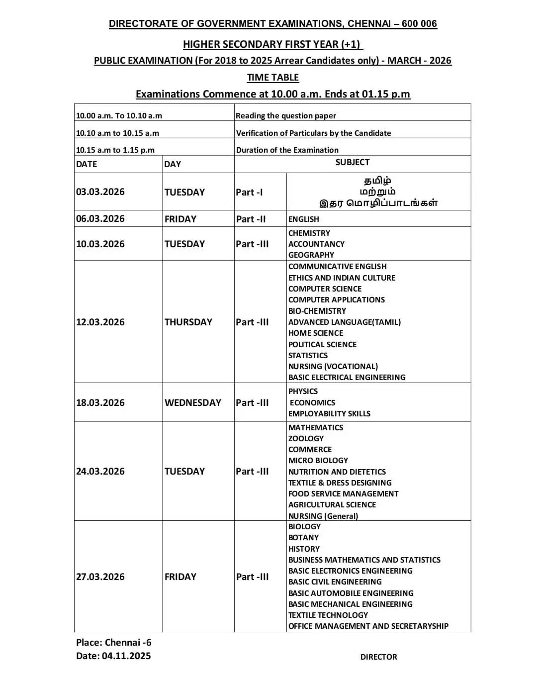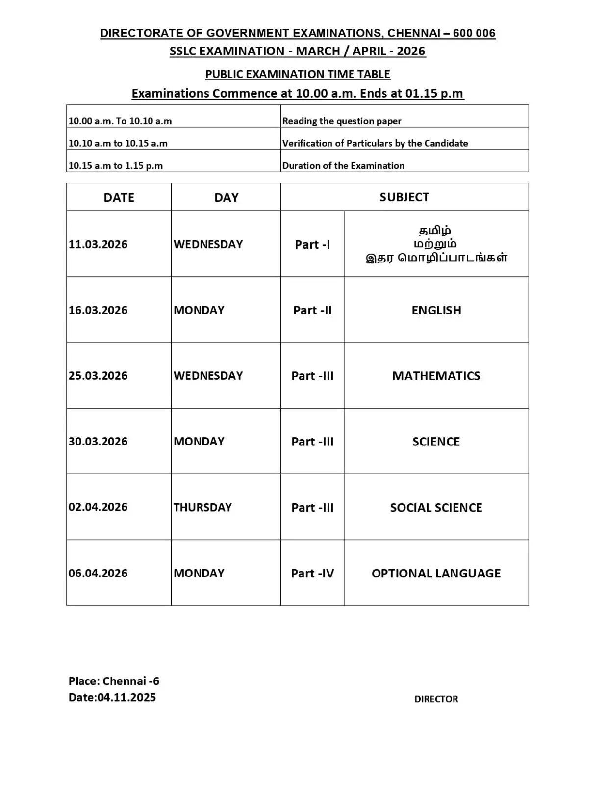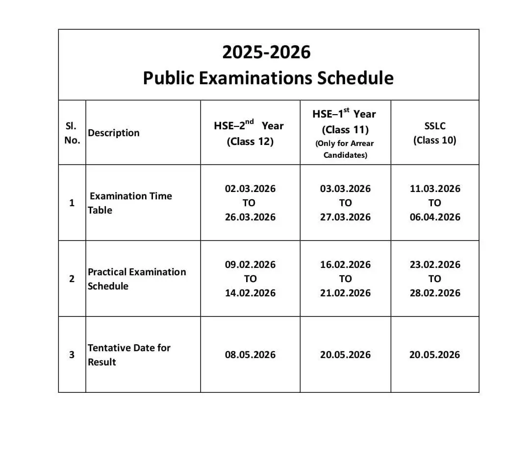 அதன்படி, 10 ஆம் வகுப்பு பொதுத்தேர்வு மார்ச் 11 முதல் ஏப்ரல் 6 வரை நடைபெறும். 12 ஆம் வகுப்பு பொதுத்தேர்வு மார்ச் 2 முதல் மார்ச் 26 வரை நடைபெறும் என அறிவிக்கப்பட்டுள்ளது. தேர்வுத் தேதிகள், 2026 ஆம் ஆண்டு நடைபெற உள்ள சட்டசபைத் தேர்தலை கருத்தில் கொண்டு நிர்ணயிக்கப்பட்டதாகவும் தெரிவிக்கப்பட்டுள்ளது.