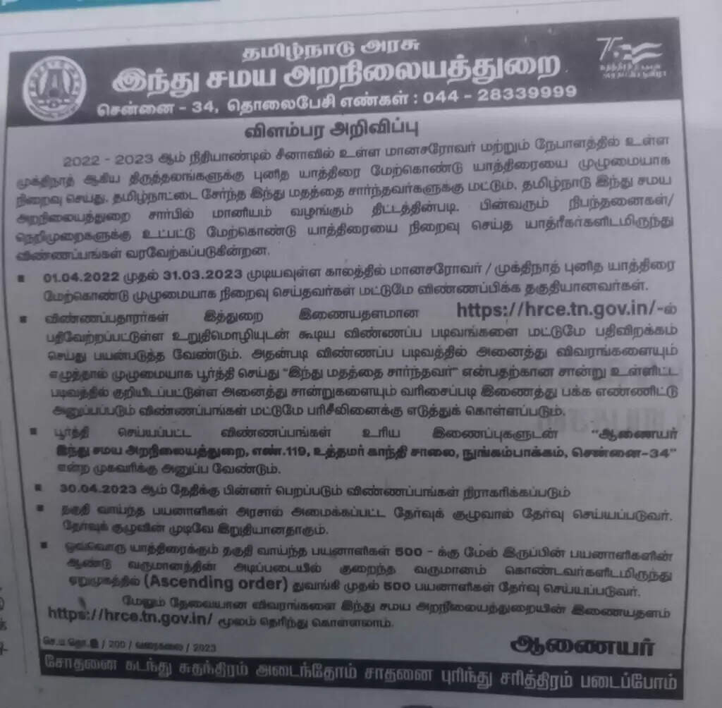 சீனாவில் உள்ள மானசரோவர், நேபாளத்தில் உள்ள முக்திநாத் ஆகிய திருத்தலங்களுக்கு புனித யாத்திரையை முழுமையாக நிறைவு செய்து, தமிழகத்தை சேர்ந்த இந்து மதத்தை சேர்ந்தவர்களுக்கு தமிழக இந்து சமய அறநிலையத்துறை சார்பில் மானியம் வழங்கும் திட்டம் செயல்படுத்தப்பட்டு வருகிறது. அதன்படி, கடந்த ஆண்டு ஏப்ரல் 1ஆம் தேதியில் இருந்து வருகிற 31ஆம் தேதி முடிய உள்ள காலங்களில் மானசரோவர் மற்றும் முக்திநாத் புனித யாத்திரையை நிறைவு செய்தவர்கள் மட்டுமே விண்ணப்பிக்க தகுதியானவர்கள்.