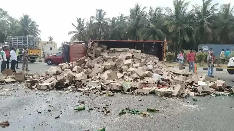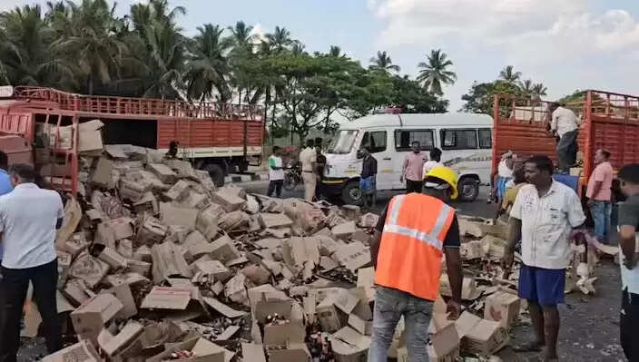 இதனால், லாரியில் கொண்டு செல்லப்பட்ட 790 மதுபாட்டில்கள் சாலையில் சிதறிக் கிடந்தன. திருப்பத்தூர் அருகே சென்னை-பெங்களூரு தேசிய நெடுஞ்சாலையில் சென்ற வாகன ஓட்டிகள் மற்றும் அப்பகுதி மக்கள் சிதறி கிடந்த பாட்டில்களை முதலில் எடுக்க தொடங்கினர். லாரி டிரைவரும், கிளீனரும் மதுபாட்டில்களை ஏற்றிச் சென்ற அவர்களை தடுக்க முயன்றனர். பின்னர் உள்ளூர் காவல் நிலையத்திற்கு தகவல் கொடுத்தனர்.