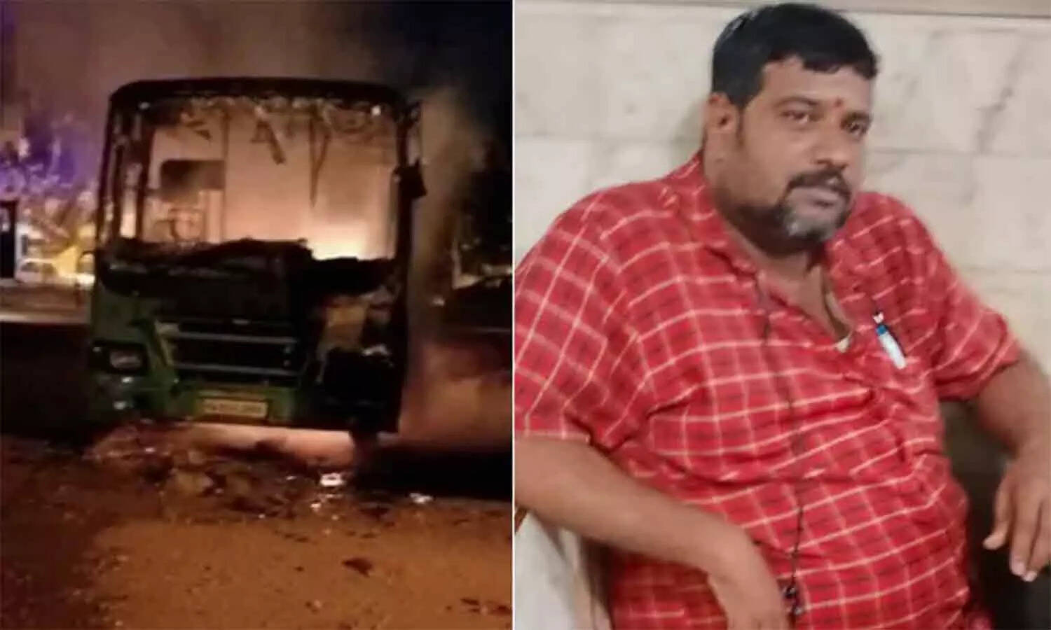 திடீரென தீப்பிடித்து எரிந்த பேருந்து !! உடல் கருகி நடத்துனர் பலி!!