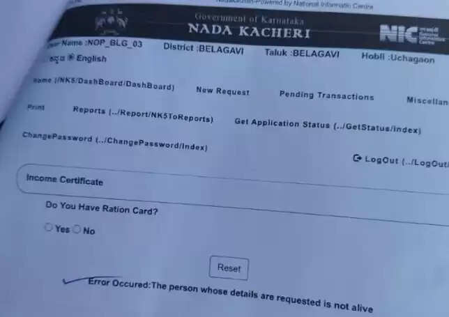 கர்நாடக மாநிலம் பெலகாவி மாவட்டத்தைச் சேர்ந்த 62 வயது முதியவர் ஒருவர் இறப்புச் சான்றிதழுடன் துணை ஆணையர் அலுவலகத்துக்கு வந்தார். கணபதி ககட்கர் என அடையாளம் காணப்பட்ட அந்த நபர், தனது இறப்புச் சான்றிதழுடன் பெலகாவி துணை ஆணையர் முகமது ரோஷனின் அலுவலகத்திற்குச் சென்றார். டேட்டா என்ட்ரி ஆபரேட்டர் செய்த சிறு பிழையால் கணபதி இறந்துவிட்டதாக அறிவிக்கப்பட்டது. இதனால் கணபதி தனது ஆதார் அட்டை, வங்கி கணக்கு மற்றும் அரசின் பல்வேறு சலுகைகளை இழந்தார்.