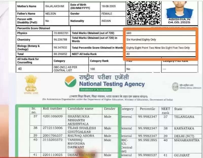 கோவை செல்வபுரம் பகுதியில் வசித்து வருபவர் நெல்சன். இவரது மகள் அபிஷ்யா. சமீபத்தில் நடந்து முடிந்த நீட் தேர்வில் அபிஷ்யா 680 மதிப்பெண்களும், இந்தியளவில் 40வது ரேங்க் என்றும் முதலில் மதிப்பெண் நகல் பதிவிறக்கத்தில் காண்பித்துள்ளது. ஆனால், தேசிய தேர்வு முகமை வெளியிட்ட முதல் 100 இடங்களைப் பிடித்த மாணவ, மாணவர்களின் பட்டியலில் மாணவி அபிஷியாவின் பெயரே இடம் பெறவில்லை. இதனால், மீண்டும் பதிவிறக்கம் செய்து பார்த்த போது மாற்று முடிவுகள் கொண்ட ஓ.எம்.ஆர், ஷீட் வந்துள்ளது.