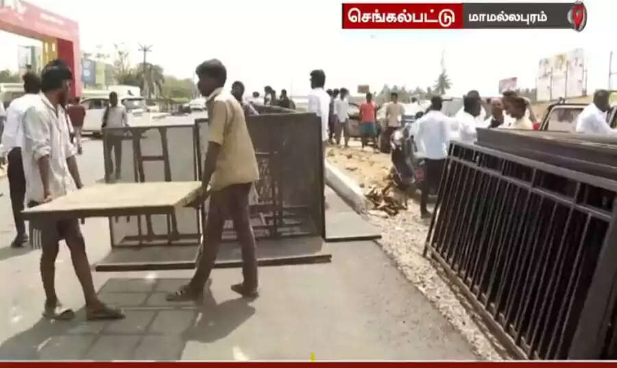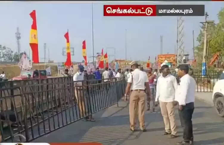 செங்கல்பட்டு மாவட்டம் மாமல்லபுரத்தில் நாளை தமிழக வெற்றி கழகத்தின் இரண்டாம் ஆண்டு துவக்க விழா நடைபெற உள்ள நிலையில் விழா நடைபெற உள்ள நட்சத்திர விடுதியின் எதிரே உள்ள சர்வீஸ் சாலையில் தமிழக வெற்றி கழகத்தினர் இரும்பு தடுப்புகளை அமைத்து வருகின்றனர். சாலையில் இரும்பு தடுப்புகளை அமைக்க கூடாது இங்கு அமைக்கப்பட்டுள்ள தடுப்புகளை உடனடியாக அகற்ற வேண்டும் என தமிழக வெற்றி கழக தொண்டர்களிடம் காவல்துறையினர் கூறி வருகின்றனர்.