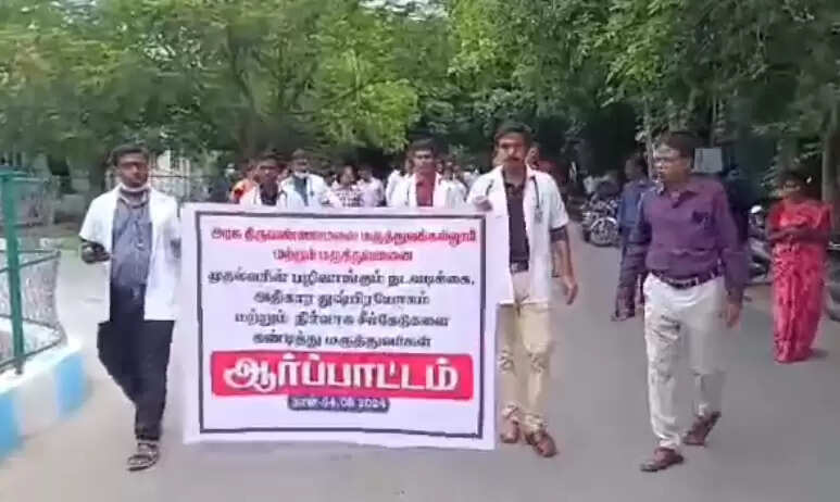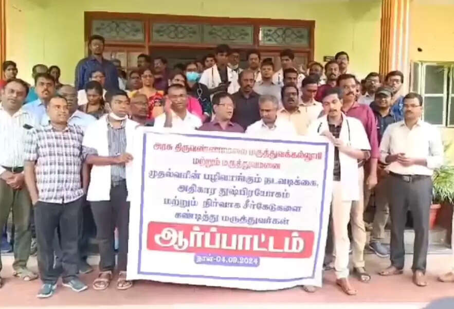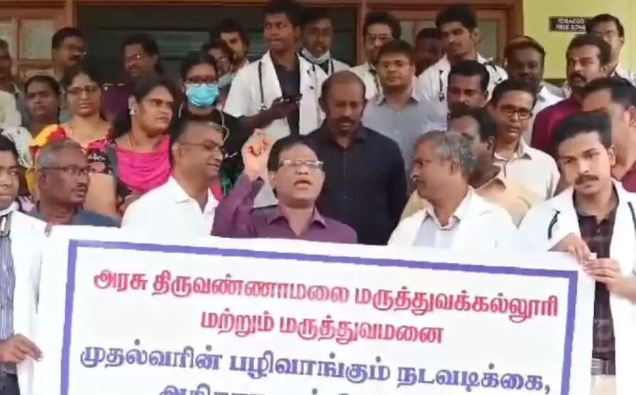 திருவண்ணாமலை அரசு மருத்துவகல்லூரி மருத்துவமனை நிர்வாகம் அலுவலகம் முன்பு அரசு மருத்துவர்கள் இன்று கண்டன ஆர்ப்பாட்டத்தில் ஈடுபட்டனர். இந்த ஆர்ப்பாட்டத்தில் திருவண்ணாமலைஅரசு மருத்துவகல்லூரி மருத்துவமனை முதல்வரின் பழிவாங்கும் நடவடிக்கை, அதிகார துஷ்பிரயோகம் மற்றும் நிர்வாக சீர்கேடுகளை கண்டித்து அரசு மருத்துவர்கள் கண்டன ஆர்ப்பாட்டத்தில் ஈடுபட்டனர்.