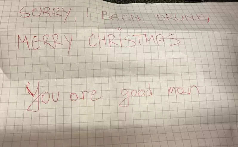 அந்தக் கடிதத்தில், மது போதையில் தவறு செய்துவிட்டதாக குறிப்பிட்டிருந்தார். கடை உரிமையாளர் நல்ல மனிதர் என்றும் கிறிஸ்துமஸ் வாழ்த்துகளையும் தெரிவித்திருந்தார். விலையுயர்ந்த கருவிகள் சேதமின்றி திரும்பக் கிடைத்ததால் கடை உரிமையாளர் மகிழ்ச்சியடைந்தார். இந்த சம்பவம் சமூக வலைதளங்களில் வைரலாகி வருகிறது.