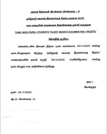 தமிழ்நாட்டில் நாளை (நவம்பர் 29) நடைபெற இருந்த ஊரகத் திறனாய்வு தேர்வு, டிட்வா புயல் காரணமாக சகல மாவட்டங்களிலும் கனமழை எச்சரிக்கை விடுக்கப்பட்டதால், ஒரு வாரம் தள்ளிவைக்கப்பட்டுள்ளது. இதன்படி, தேர்வு புதிய தேதியாக டிசம்பர் 6, சனிக்கிழமை நடைபெறும் என அரசுத் தேர்வு இயக்ககம் அறிவித்துள்ளது.