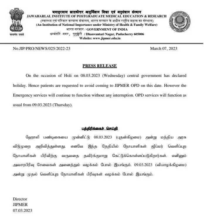நாளை மத்திய அரசு விடுமுறை அறிவிப்பு! ஜிப்மர் மருத்துவமனையின் இந்த பிரிவுகள் இயங்காது!