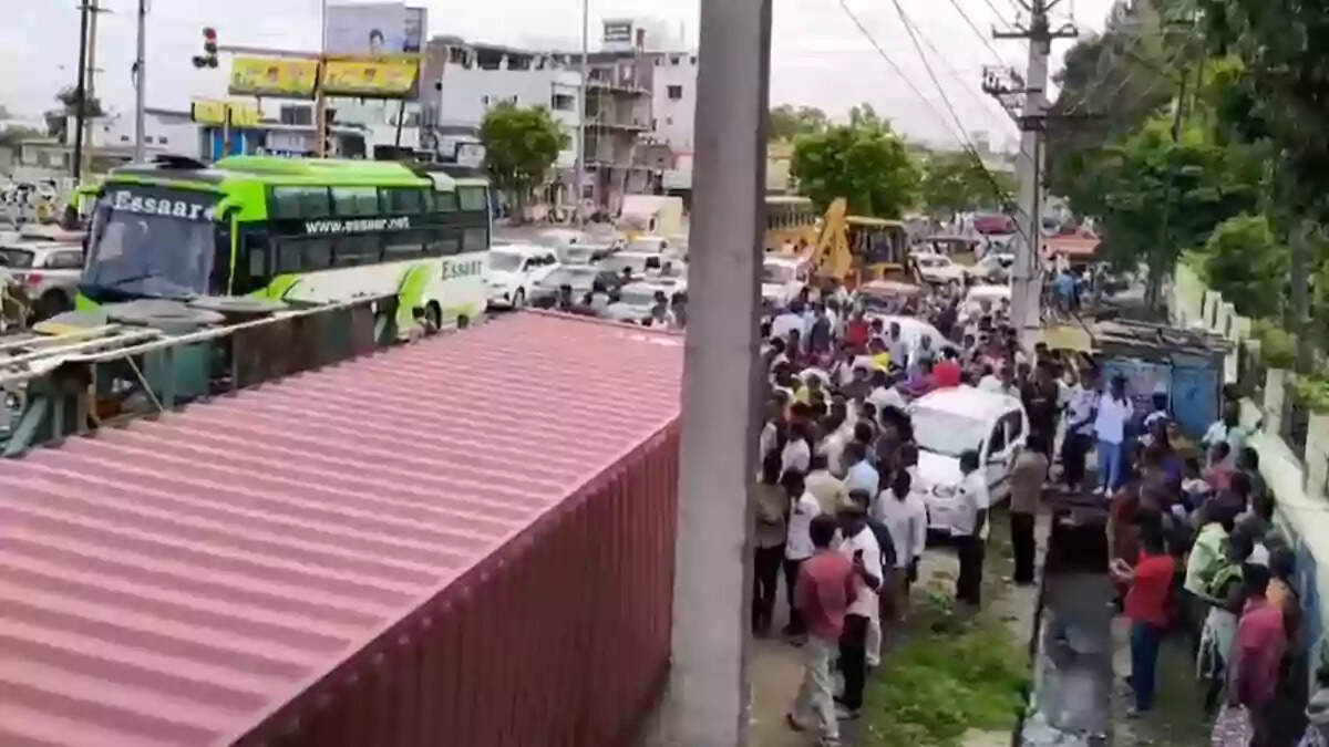 இதில், சாலையோரமாக நின்று கொண்டிருந்த பெண்கள் மீது கண்டெய்னர் லாரி விழுந்ததில் லாரிக்கு அடியில் சிக்கி உள்ள பெண்களை மீட்கும் பணி தீவிரமாக நடைபெற்றது. உடனடியாக உள்ளூர் காவல்துறையினர், தீயணைப்பு வீரர்கள் மற்றும் மீட்பு குழுவினர் சம்பவ இடத்திற்கு விரைந்து, லாரியின் அடியில் சிக்கியவர்களை மீட்கும் பணியில் ஈடுபட்டனர்.