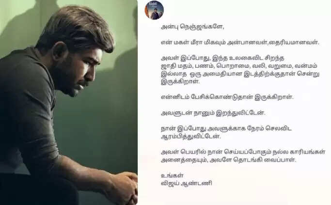 இந்நிகழ்வு ஒட்டுமொத்த சினிமா உலகை அதிர வைத்த்து. குடும்பத்தின் சோகம் இன்னும் தீரவில்லை. இந்நிலையில், மகளின் இழப்பு குறித்து நடிகர் விஜய் ஆண்டனியின் மனைவி தனது டுவிட்டர் பக்கத்தில் உருக்கமான பதிவு ஒன்றை வெளியிட்டுள்ளார்.