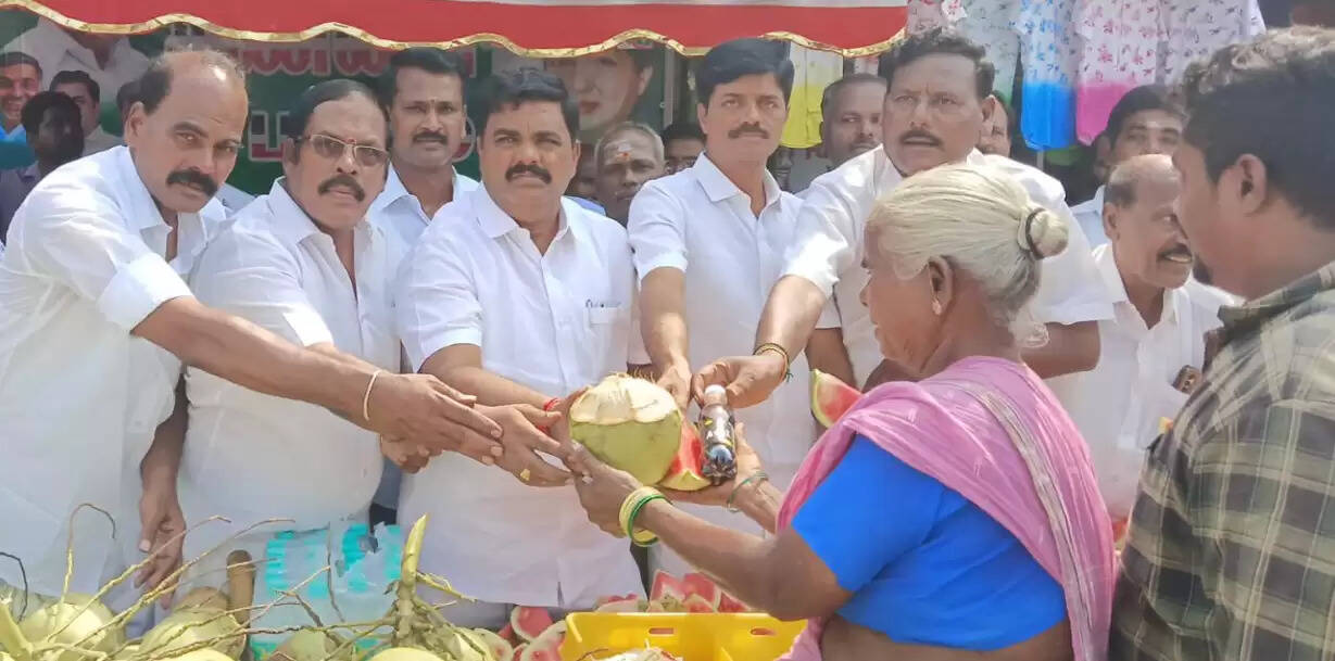 அதிமுக, திமுகவினர் அமைக்கின்ற நீர்மோர் பந்தல்களில் பெரும்பாலான இடங்களில் அரசியல் தலைவர்கள், பந்தலைத் திறந்து வைத்து கிளம்பியதும் கட்சியினரே பந்தலில் உள்ள பழங்களைக் காலி செய்து விட்டு இடத்தை காலி செய்து வரும் நிலையில், விஜய்யின் தமிழக வெற்றிக் கழகத்தினர், கையில் எடுத்து செல்ல முடியாத அளவில் கைகளில் பழங்களை அள்ளி கொடுத்ததால் மகிழ்ச்சியில் மக்கள் திளைத்தனர்.