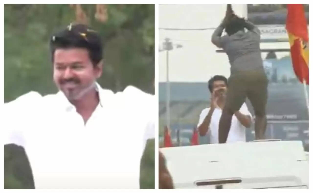 வைரல் வீடியோ... ரோடு ஷோ வாகனத்தில் ஏறி நடிகர் விஜய்யை தெறிக்க விட்ட ரசிகர்!