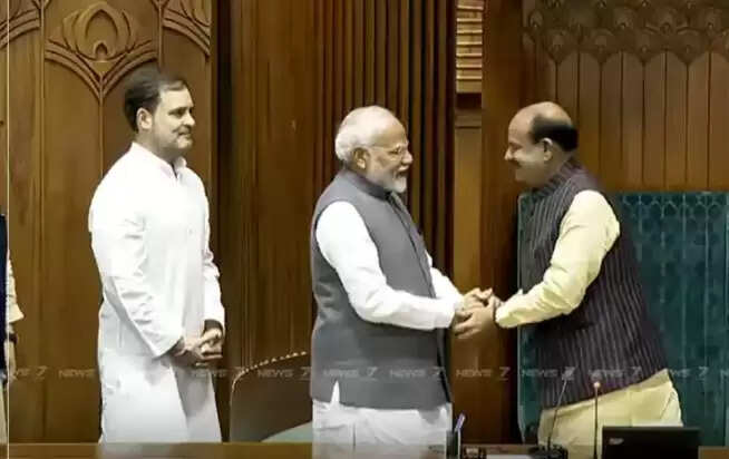 இதையடுத்து, ஓம் பிர்லாவை மோடியும், ராகுல் காந்தியும் ஒன்றுசேர அழைத்துச் சென்று மக்களவைத் தலைவருக்கான இருக்கையில் அமர வைத்தனர். தொடர்ந்து, ஓம் பிர்லாவை வாழ்த்தி மோடியும், ராகுல் காந்தியும் அவையில் உரையாற்றினர்.